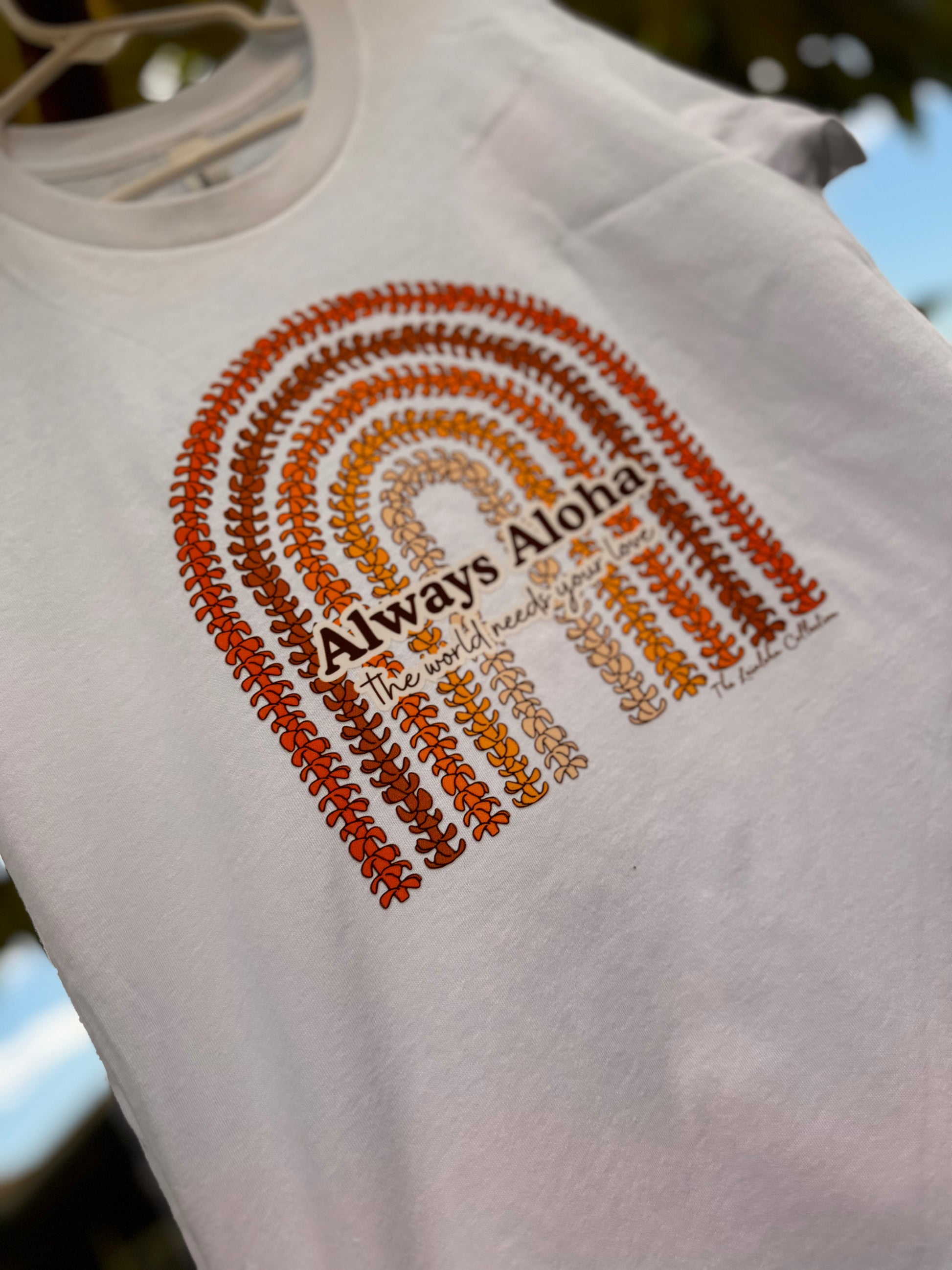 Always Aloha, the world needs your love puakenikeni Rainbow lei design on a comfy White color unisex 100% cotton airline jersey T-shirt.